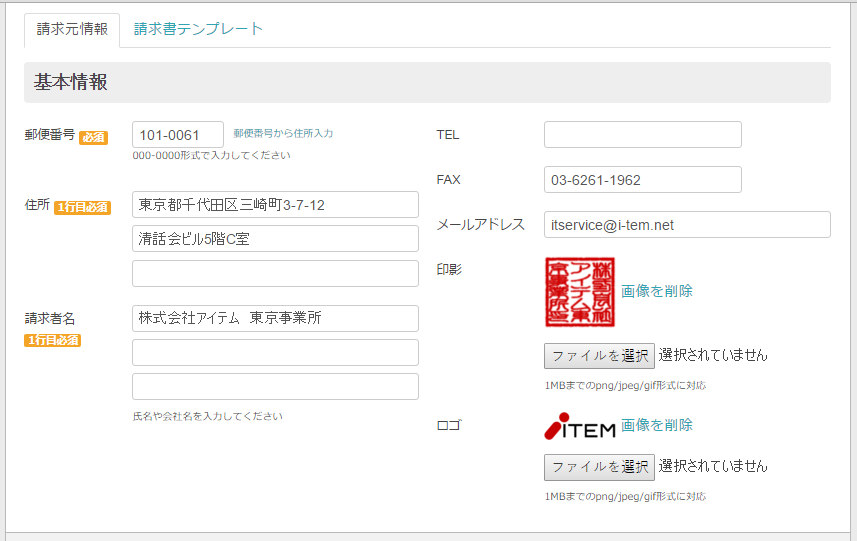 次に、ドキュメントの基本情報の記入。ロゴや印章データをアップロードすれば、請求書に反映されます。