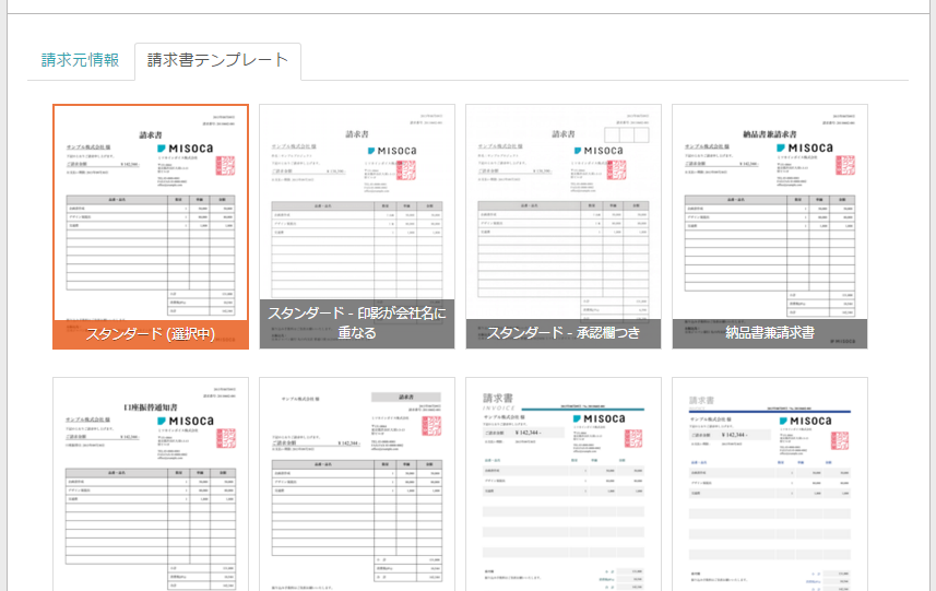 以上で、見積書や納品書、請求書の作成がオンラインで出来るようになります。PDF書き出し、メール送信、印刷、FAX送付(見積書)、郵送代行(請求書)などさまざまな出力・発行が可能。個人的に気に入った点は、請求書のデザインが数種類あること。発行する請求書ごとにデザインを選べる自由度もあります。